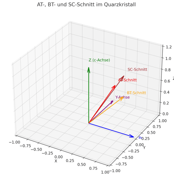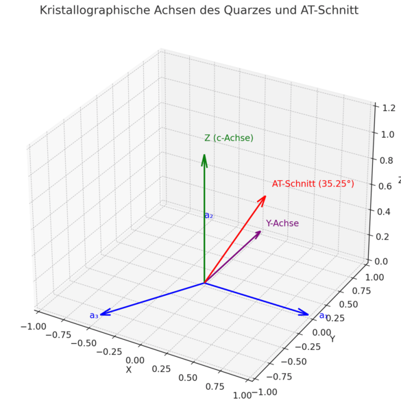 The AT section is an inclined section (approx. 35.25°) against the Z axis in the X-Z plane. It is used to produce temperature-stable oscillating crystals. The oscillation takes place in the plate plane (planar mode).