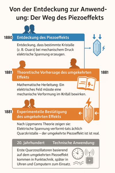 - Description: The Curie brothers discovered that certain crystals (e.g. quartz, tourmaline, topaz) generate electrical charges on their surfaces during mechanical deformation - this effect became known as the direct piezoelectric effect.